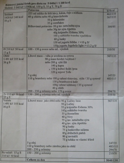 Ahoj holky, přidám se k vám. V mládí jsem byla takovej hubeňour, že se za mnou otáčeli lidi ještě na střední škole, jezdila jsem jako prcek i do ozdravoven, no ale po 2 dětech ve 33 letech mám 71 kg a výška 175. Ráda bych tak do 60 jako před 2. porodem. Kamarádka měla něco ke 100 kg, držela 5.000kj dietu a do roka zhubla krásných 20 kg, rok už na to kašle a stále má stejnou váhu, takže pomalu, ale jistě. Co se týče pečiva: prý je lepší jeden krajíc chleba než 2 suchary, více to zasytí a kaloricky to vyjde nastejno!!!!!!!! To jí říkal každý diabetolog i její muž, je doktor. K večeři si doprála i celý ten sýr cottage k dalamánku. Ofotim Vám její rozpis jídla od doktora. Také jsem se do toho pustila, docela mě to baví. K tomu ráno, když vyprovodim dceru do školy, běhám 3 x 7 pater u nás v paneláku, zatím jen týden, ale zlepšení je znát, mám dole 2 kg a lepší fyzičku
