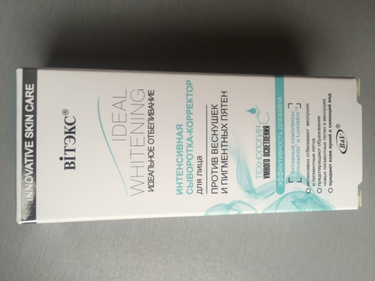 Ideal Whitening sérum je speciální přípravek cílený na zesvětlení pigmentových skvrn vzniklých v důsledku působení slunečního záření na pleť. Unikátní technologie "Smart Whitening" pomáhá aktivním složkám proniknout hluboko do kůže, kde vzniká vlivem zdlouhavé regenerace v kombinaci se slunečním zářením pigmentová skvrna (z jizvy po akné v kombinaci se slunečním zářením/ soláriem). Dermawhite je komplex aktivních látek nabízející bělící efekt přímo v místě tmavého pigmentu. Ideal Whitening sérum obsahuje kyselinu mléčnou, která má hydratační, antibakteriální a protizánětlivé účinky, zklidňuje podráždění a zároveň potlačuje množení bakterií. Kyselina mléčná má zároveň exfoliační a bělící účinek, urychluje regeneraci ochranného filmu pleti. Unikátní technologie "Smart Whitening" s proaktivními patentovanými komponenty Dermawhite - patentovaný bělící komplex blokující tvorbu melaninu zabraňující vzniku pigmentových a stařeckých skvrn. Účinnost klinicky prokázána. Lumiskin™ získavaný z kůry čilského stromu Boldo je inhibitor buněčných receptorů, které pronikají do hloubky pokožky a šetrně pigmentové skvrny bělí. Pigmentové skvrny mizí ze dne na den. Deklarováno světovým lídrem ve vývoji účinných látek pro kosmetický průmysl Sederma z Francie.