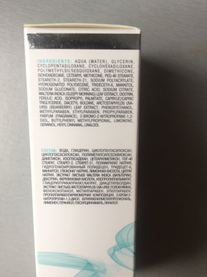 voda, glycerin, cyklopentasiloxanu, tsiklogeksasiloksan, polimetilsilseskvioksan, dimethikon, isohexadekan, tsetearilmetikon, PEG-40-stearát, steareth-2, steareth-21, polyakrylát sodný, hydrogenovaný polydecen, trideceth-6, mannitol, glukonát sodný, kyselinu citrónovou, citrát sodný, výtažek z listů WALTERIA Indica (Walter), dextrin, kyselina ferulinovaya, isopropyl palmitát, glitseriltrikaprilat / kaprát, diatsetilboldin výtažek z listů medvědice lékařské (Bearberry), parfémy, benzylalkohol, Methylchloroisothiazolinone, Methylisothiazolinone, 2-brom-2-nitropropan -1,3-diol, butilfenilmetilpropional, limonen, geraniol, geksiltsinnamal, linalol. 30 m