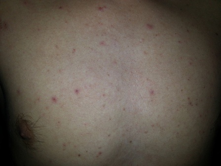 Tak tady je pic hrudníku... Možná si řeknete, že to není tak strašný, ale když si vezmete, že tohle máte na hrudníku, zádech, rukou, nohou, tak je to hodně nepříjemný...
