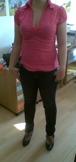 A víš kdy by to možná vypadalo ještě líp? Kdyby sis na tu košili zkusila dát vestičku - krátkou, nejlíp ve stejné barvě jako máš kalhoty (černé?) . Jednak by dodala celku šmrnc, druhak dostaneš stejnou barvu ze spodní části nahoru, čímž tak nějak potvrdíš vzhled celého outfitu - a mimo jiné se hezky vytáhneš a prodloužíš.