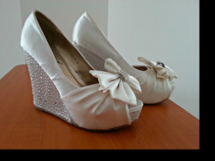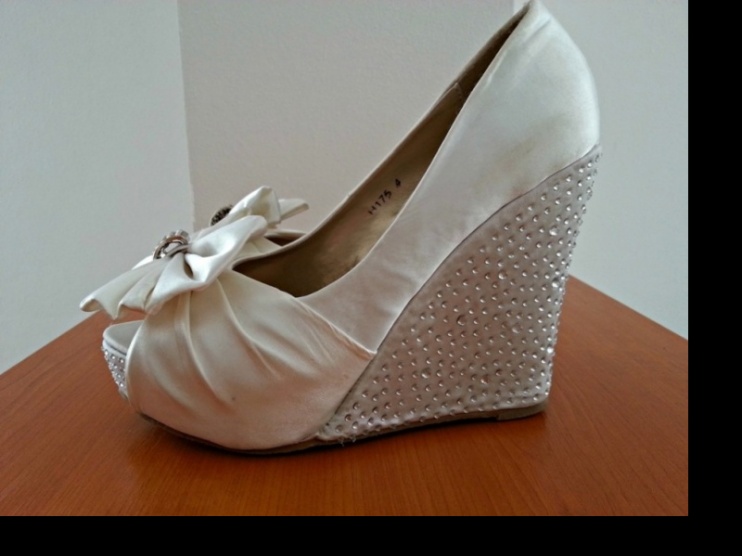 Prodám tyto botky jednou použité na mé svatbě. Stav viz. foto. Označení vel. 4 (37), délka stélky: 23-23,5 cm. Botky jsou smetánkové (Ivory odstín). Výška podpatku: 11,5 cm, platforma 3,5 cm. Zasílám s originální krabicí.