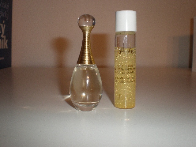 Jadore od Diora EDP 5ml (nepoužitý) + třpytivý parfémovaný olej (jednou požitý, původně 7,5ml) přibližně 5,5ml. Bohužel mi vůně nesedí.