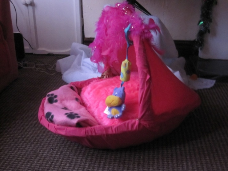 košík na kvety obtiahnutý plachtou a vo vnútry chlpatý vankúš a deka .. Spáva tam ked sme dole v obývačke, ale v noci spí somnou v postely na vankúši obtočená okolo mojej hlavy