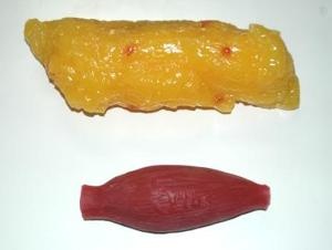 Ve Jste to, co jíte, předváděli jedné z účastnic, kolik má v těle tuku, pomocí takových velikých ,,salámů" tuku. Zkrátka tuk, sádlo zabalené v těch obalech, co je třeba šunka. Tolik kil tuku, co měla v těle, bylo kil ,,salámů". Takže zřejmě kilo tuku v těle odpovídá kilu sádla