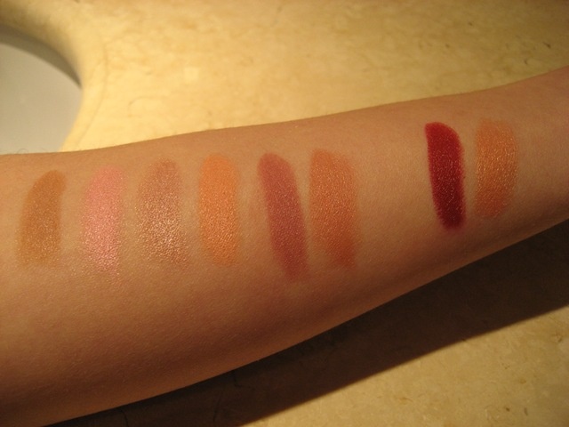 obrázok 1, zľava doprava: Circe ( true nude), Strawberry Milk (milky baby pink), Summer Love (beigey-pink with gold sheen), Orange Soda (milky light peach), Thalia (neutral pink that would suit just about any skintone), Pumpkin Pie (beigey peach), Snow White (true blue-based red), and Iris (frosted light peach)
