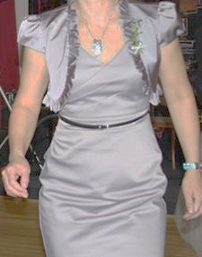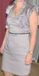 Vyhodit bolerko a pásek. Dala bych asi výrazný náhrdelník (statement necklace), vidím teď všude v obchodech takový výrazný složený z několika barevných perel. Pak už bych asi jen doladila perlové náušnice a možná výrazný prsten - hodily by se mi k tomuto odstínu šatů tyrkysové šperky. Zlato a stříbro se mi nehodí vůbec. Stejně bych to s těmi doplňky nepřehánela, šaty jsou sice šedé, ale s leskem, samy o sobě dost výrazné.