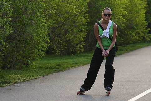 Našla jsem fotku, na které se to pokusím objasnit. Moje pravá noha, má tendenci se naklánět jako pravá noha slečny na obrázku - naklání se mi opačně, směrem ven v době kdy na brusli stojím, jedu