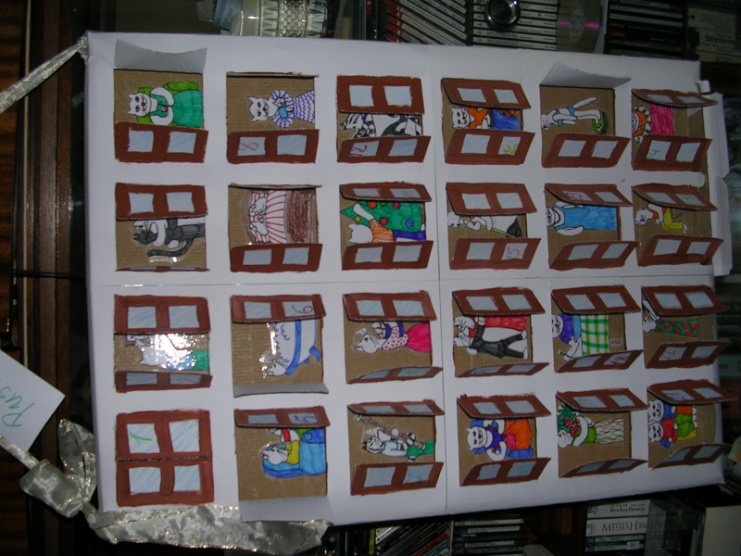 Přítelovi jsem loni sama vyrobila obrovskej adventní kalendář. Vypadal jako ty kupované, s perforovanými okýnky (to mi dalo pořádně zabrat), v každém okýnku byla malá čokoládka, sušenka, ferrero a tak.