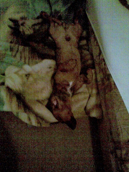 Spí právě, jak miminko, úplně nejroztomilejší. Páteř do U, takže si čuchá řiť. Nebo na boku, všechny nožky přitáhlé k tělu. V posteli když spával, tak u našich noch a zase v klubíčku.