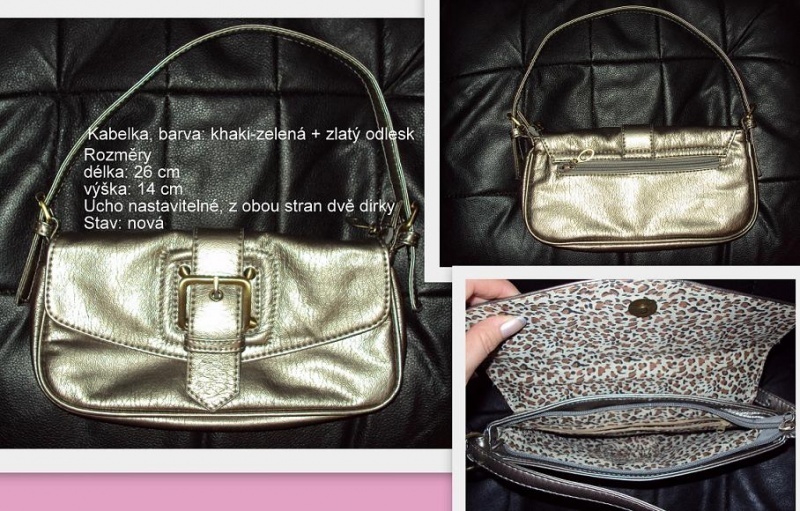 Prodám malou kabelku přes rameno, rozměry jsou 26 centimetrů délka a 14 centimetrů výška. Je nenošená, pouze mi doma leží, protože mám kabelek vícero, tak tuto nevyužiji. Barva je taková khaki lesklá, více napoví fotografie. Cena 290,- včetně pošty.