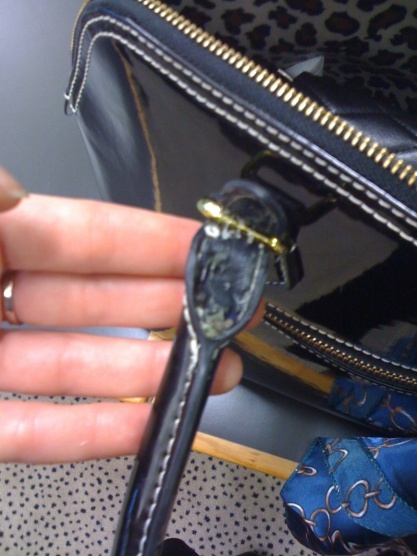 Jinak posílám fotky, jak mi ruplo před 2 dny ucho Další očividně drží Pohromadě jen silou vůle. Ptala jsem se brašnáře a spravit to neumí. To černé pogumování (jak se pod tím schovávají lemy) je prostě oříšek. Maximálně je prý rozumné dát do každého ucha zlatý nýt...