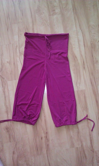Kalhoty mám. Foto přikládám. Trošku klame. Na fotu vypadají dost fialově oproti skutečné barvě, která je dost růžová. Není to fakt žádný luxus, takový fakt neprodyšný legíny jako jsem měla jako malá. Přemýšlela jsem, že je vytáhnu na brusle, protože mi ladí k bruslím, batohu, ale nevím, asi to není dobrý matroš na odvádění potu. Mě se dřív z umělých triček dělala vyrážka.