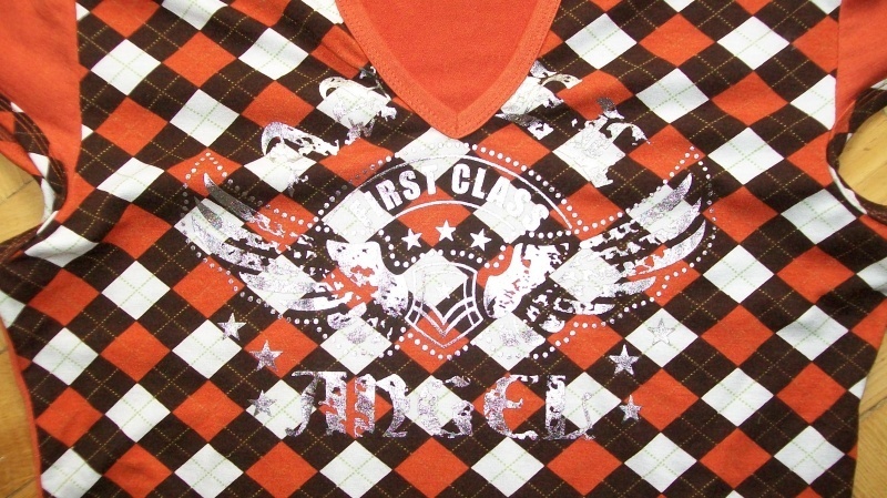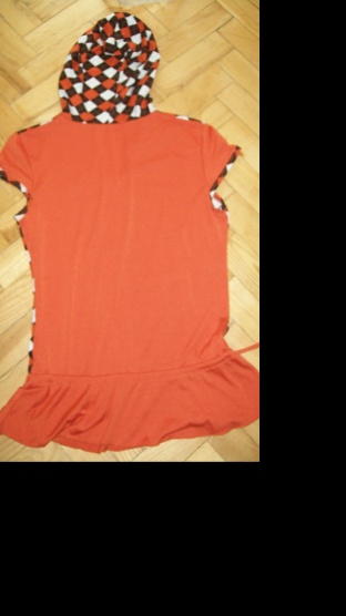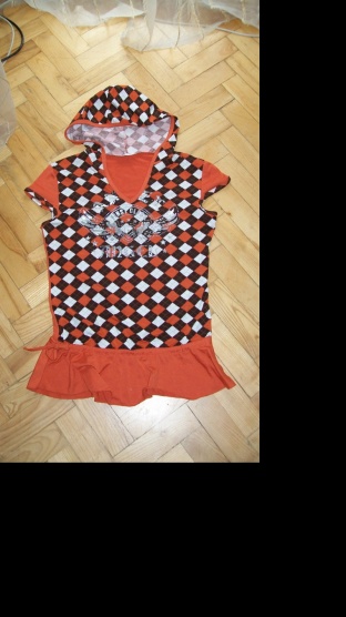 kombinace barev: bílé, tmavě hnědé a cihlové. Ve předu stříbrný obrázek, má snížený pas,kde je šňůrka která se dá utáhnout. Délka je 64 cm