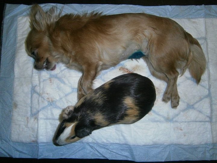 viz fotka mojí kamarádky jedné miniaturní čivavky po operaci ve srovnání s morčetem.