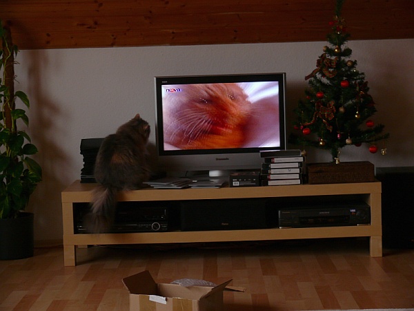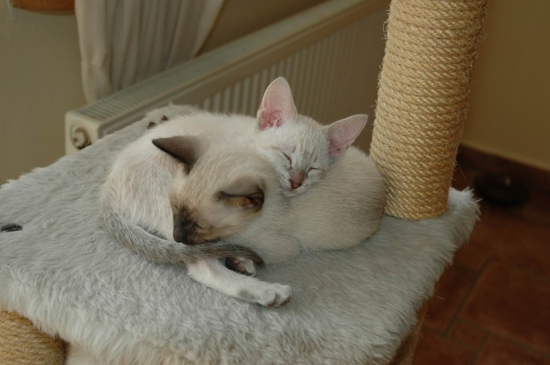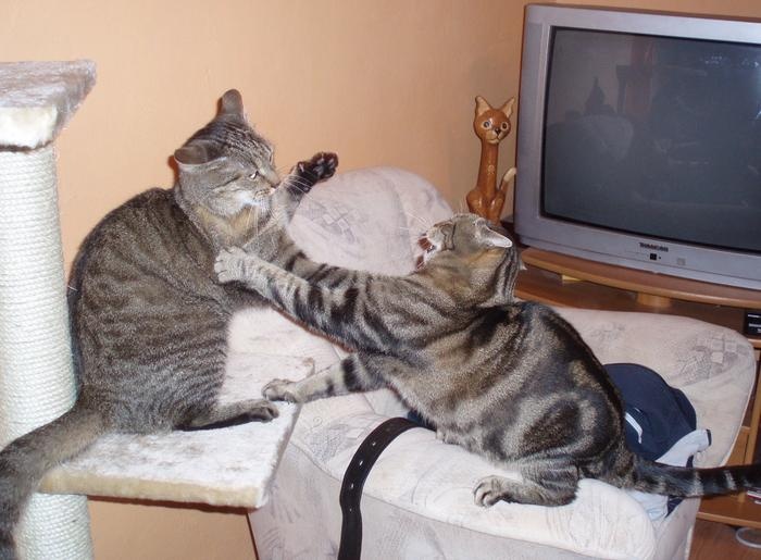 Naše miciny - oba dva nalezeci, věk u kocoura asi 2,5 a kočka asi 4 roky. Takhle to u nás vypadá velmi často - moc se spolu za ty dva roky nezkamarádili...