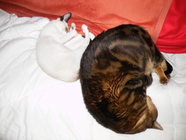 To jsou dvě z našich tří kočiček. Oba teda kocouři. Menší je půlroční seychelák a větší šestiletý bengál