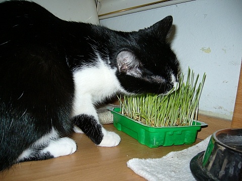 ) a taky mi trávu prve nežrala. Dokonce mi ji rozhrabala po celý chodbě, tak to mě fakt vytočilo a dlouho neměla nic.Další pokus dopadl lépe,ji okusovala. Ale kočka není králík, takže ji nestačila ožírat a trávy bylo najednou moc. Fotku mám o něco výš a je to jediná fotka, kdy žere trávu.