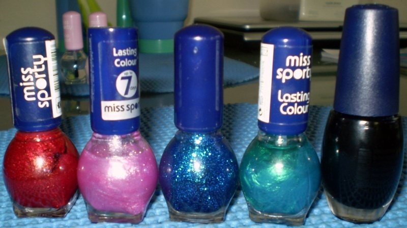 Prodám kolekci laků na nehty Miss Sporty (vínová, modrý glitter, růžová, akvamarín) plus černý Konad.