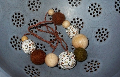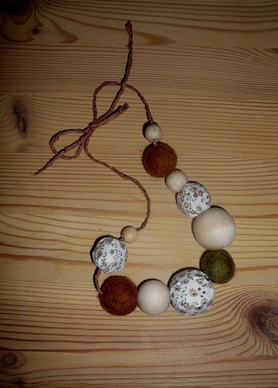 Ručně šité korálky z kvalitní zahraniční jemné 100% bavlny, plsťenky, přírodní dřevěné korálky, dřevěné akrylky - navlečené na hedvábné šňurce..
