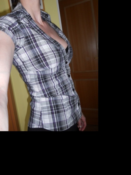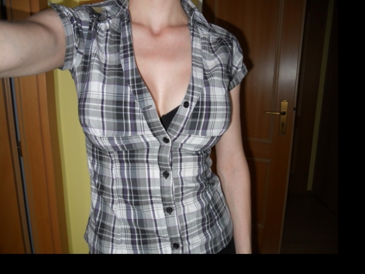 Prodám košili, která mi je malá - nedopnu přes prsa, jak je vidět na fotce. Jsou na ní černé, šedé, fialové a bílé proužky. Materiál je lehce pružný.