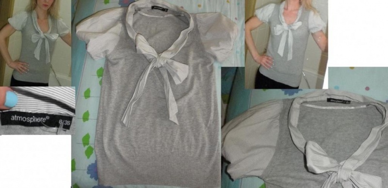 svetřík nejspíše bavlněný řekla bych, s košilí balonkovými rukávky a mašlí obojí jemný proužek