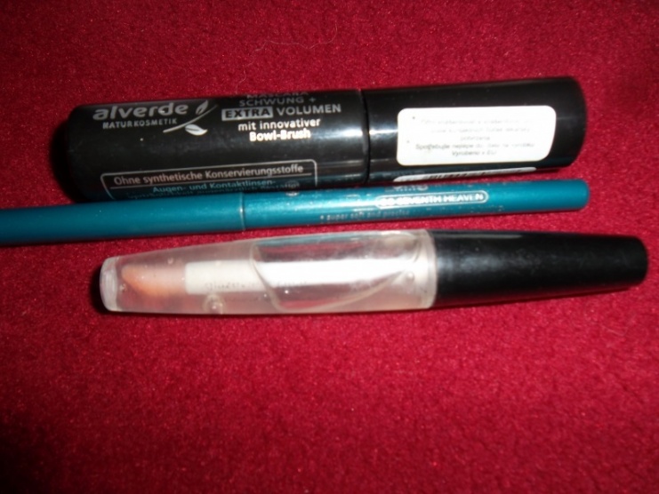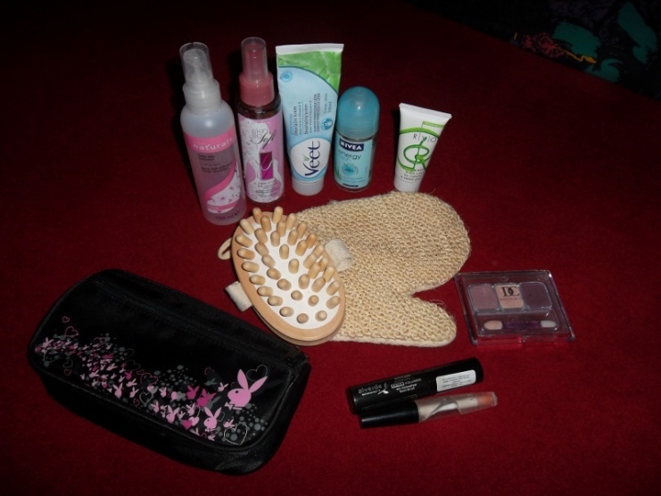 Taštička play boy, sada masážního kartáče a rukavice Avon , oční stíny Dermacol , řasenku Alverde , tužka na oči Essence , Lesk na rty Avon .