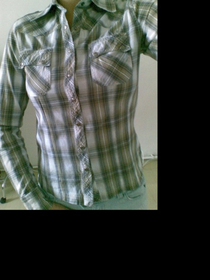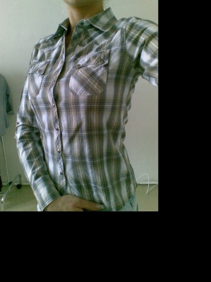 Prodám jak novou kostkovanou košili na patenty. Kostky jsou orámovány khaki zelenou a světle šedou barvou, střed bílý.