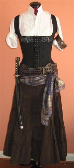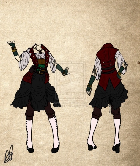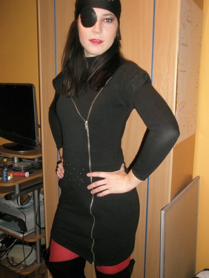 Bílou halenku nebo košili a na to hodit buď korzet nebo vestu. K tomu bych si vzala černý kalhoty nebo černou skládanou sukni, širokej pásek a vysoký kozačky. Na krk nějake zlatej přívěsek, na hlavu dej šátek a pásku přes oko