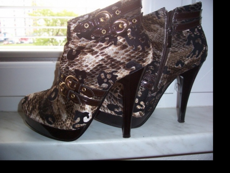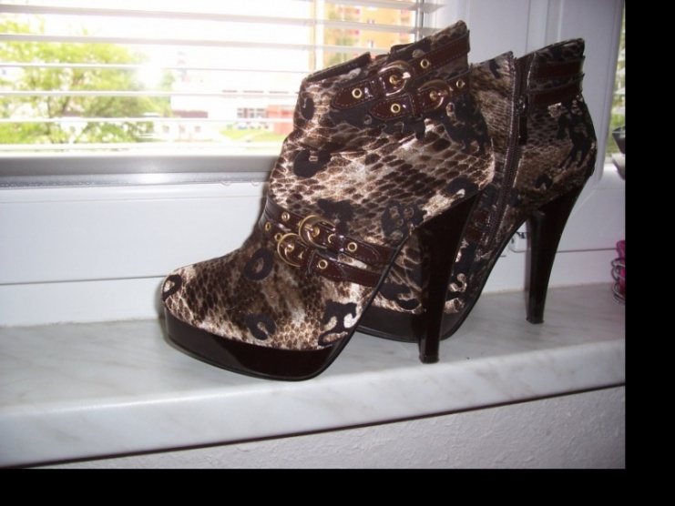 Prodám tyto krásné kotníkové kozačky, velikost 37, vepředu platforma 2 cm, podpatek 12 cm. Hadí vzor, na nártu a vzadu kolem kotníku jsou zdobeny přezkami. Měla jsem je jednou, neunosím je. Jsou jako nové, za to ručím vrácením peněz.