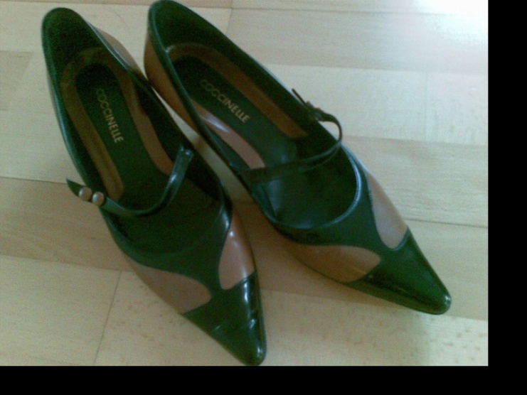 prodám koženou značkovou kabelku se střevíci znacky Coccinelle. Velikost střevíců je 38, kabelka má rozměry 13x30.Cena 1400,-