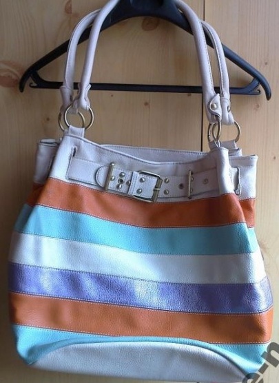 Kabelka je nošená, ale nense známky nošení. Je velmi prostorná. Vleze se do ní sešit velikosti A4. Barevné proužky působí hravě, mladistvě.