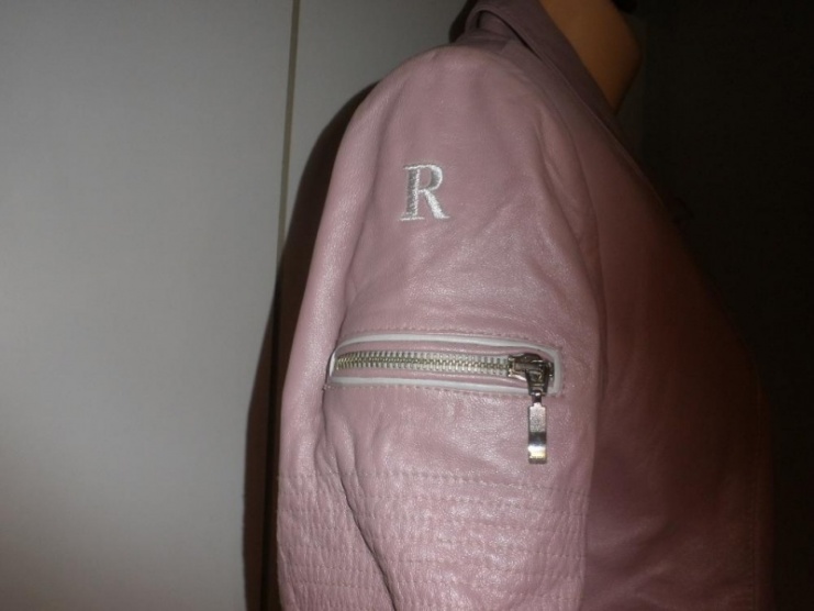 Vypadá krásně, je to pudrově růžová barva, na ramenou falešné zipy, v kapsách a uvnitř je růžová saténová podšívka (uvnitř bundy je malý flíček - nezkoušela jsem vyčistit), každopádně je slušivá a dělá hezkou siluetu.
