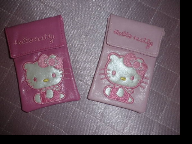 Dvě nová koženková pouzdra s motivem Hello Kitty, zapínání na suchý zip, lze je nosit i na krku (šňůrka je schovaná vevnitř), nevhodný dar, nevyužiju, tak posílám dále.