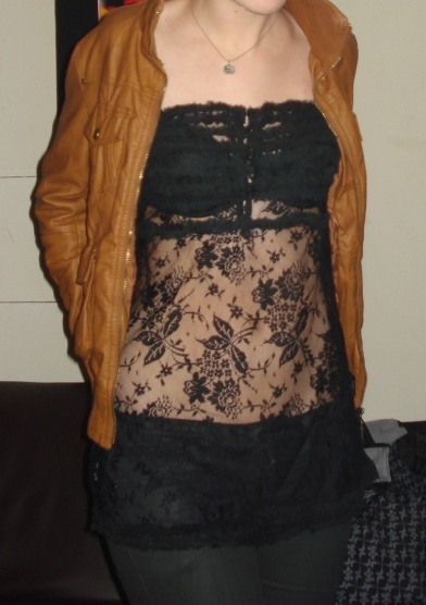 Úplně nové, měla jsem ho jen na jedné akci, už nevyužiji, je na mě moc odvážné. Je celé krajkové+ dole mašlička na stažení a nahoře knoflíčky. Krásně provedené.