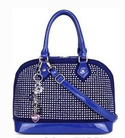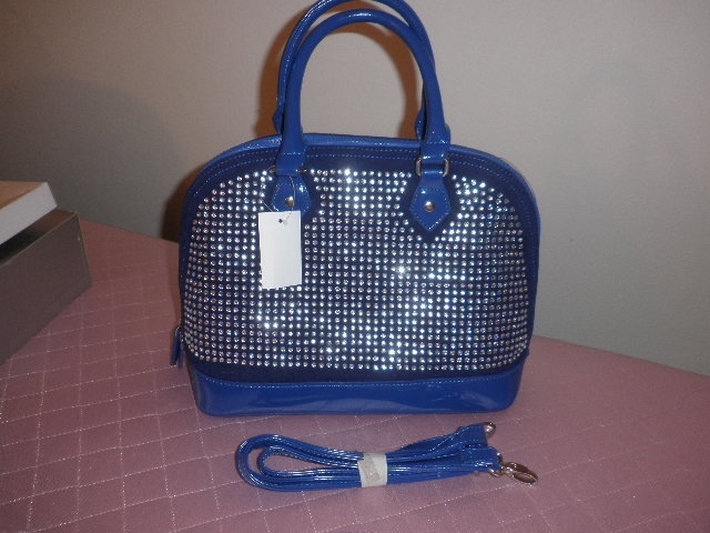 Krásná nová tm. modrá kabelka (barva odpovídá ofic. fotce) s kamínky - nošení v ruce, odepínatelný popruh, díky kterému ji můžete nosit i přes rameno. Oblíbený tvar, součástí je odepínatelný přívěsek.