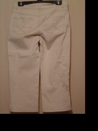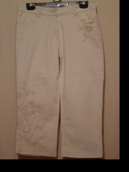 Prodám nové, parádní 3/4 kalhoty v krémové barvě zdobené výšivkami a flitry s pevným pasem s poutky, zapínáním na knoflík a malý zip, dvěmi bočními kapsami a zadní díl má také kapsy.