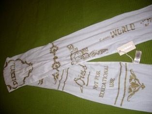 Prodám nový šál značky Diesel, celková délka 170cm, materiál 100% bavlna. Šál má světlou krémovo-bílou barvu a zlatý vzor potisku. Byl to nevhodný dárek, šály tohoto typu nenosím