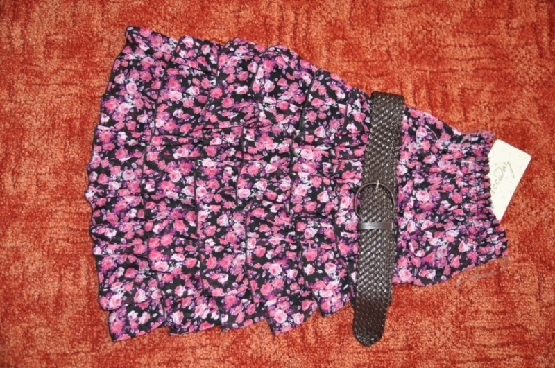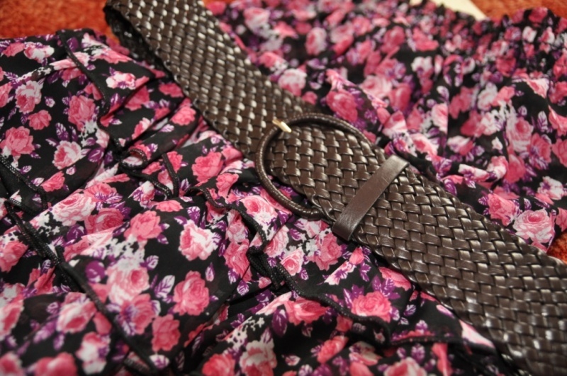 Prodám krásné volánkové šaty, základní barva černohnědá a v ní růžovočervené kytičky, s tmavě hnědým páskem po prsy, je odnímatelný. Šatičky jsou bez ramínek, gumička nad a pod prsy, pěkně drží a dělají hezkou postavu.