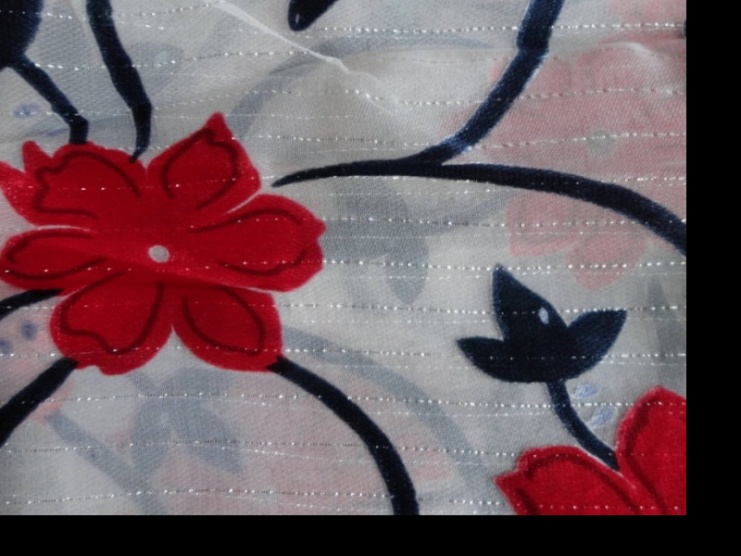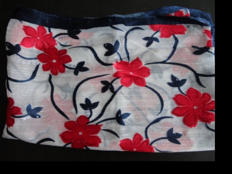 Červeno-modro-bílý šátek ze 100% přírodního hedvábí protkávaný metalickou nitkou.NenošenýRozměry: 150x50cm