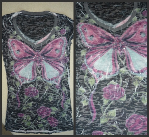Delší květovaný top s motýlem , který je posety třpytivými kamínky , ani jeden nechybí , jako nový , není to můj styl ačkoliv je to teď HIT ! Na druhé straně úplně stejný obrázek . Výstřih je do V . Zn.Bershka .. moje cena je 199 kč