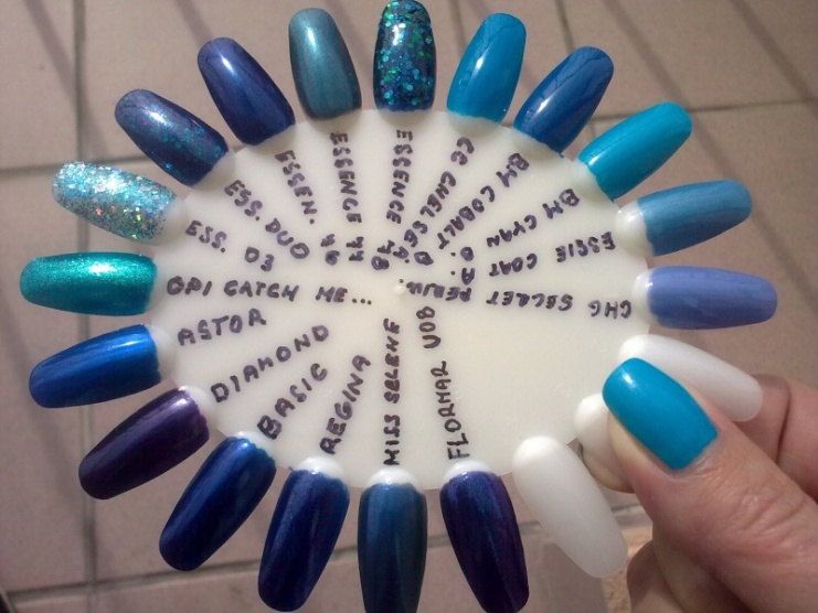 Bohužel vám tu modrou nemám moc jak přiblížit, protože se mi nepodařilo najít odstín jí podobný. (ani v obyč barvě něčeho jiného, to by bylo i hůř poznat a přímo lak to je vyloučeno) Takže vám k tomu můžu posloužit jen takto: je to taková sytě tmavě modrá, taková základní, ukázková tmavě modrá prostě, ideálně lesklá. Vždycky mě překvapovalo, že takový lak neexistuje, protože jsem přesvědčena o tom, že musí.