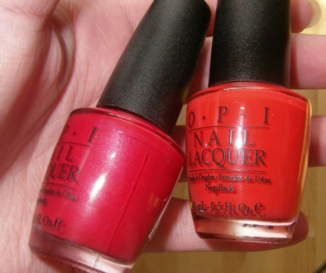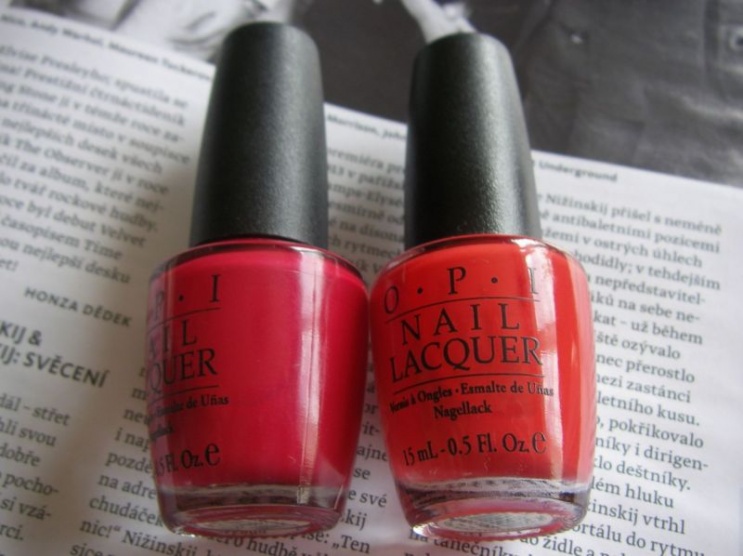 . Mam tu fotku OPI red vs. Trill of Brazil. Na prostředničku (vpravo) je OPI red.