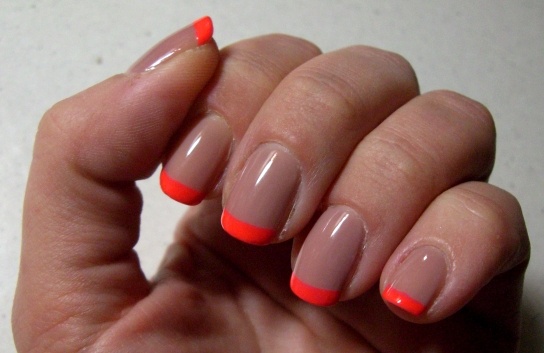 Druhé foto je předchozí manikura Opi Tickle my francey s neonovým růžovo-oranžovým lakem místo francie.