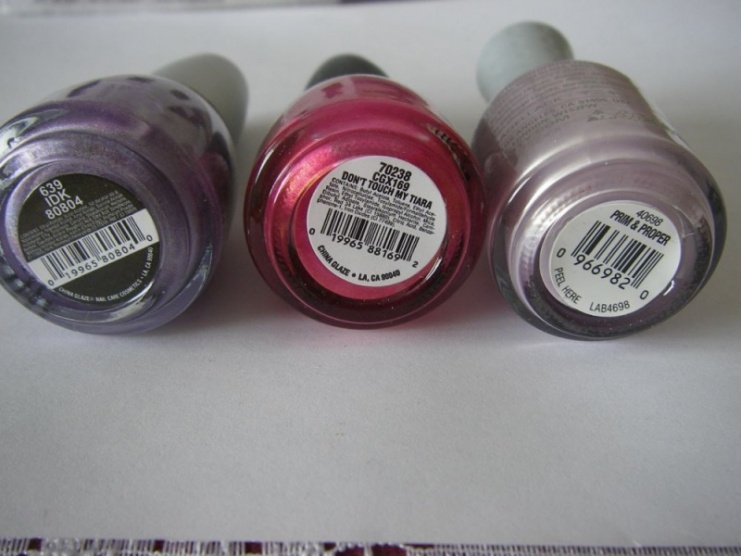 Levá ruka, od ukazováčku po malíček: Orly Prim&Proper, China Glaze Don´t touch my tiara, China Glaze 2nite, China Glaze IDK