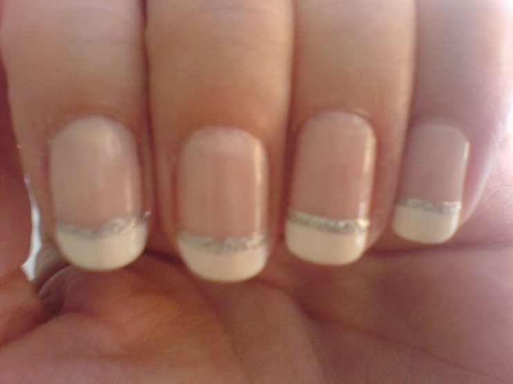 Včerejší namikura na přírodních nehtech OPI Alpine Snow a nahoře vrstva OPI Mimosas for Mr. & Mrs. s proužkem glitrové stříbrné zdobičky.