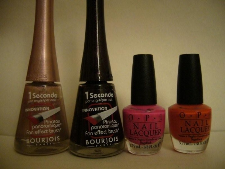 Posílám dál laky: 2 Bourjois a 2 malé OPI. Bourjois - odstíny 2 a 9, jména odstínů OPI si už nepamatuju. Jsou z letní minikolekce - myslím India, ale nevím to jistě. Foto odpovídá.