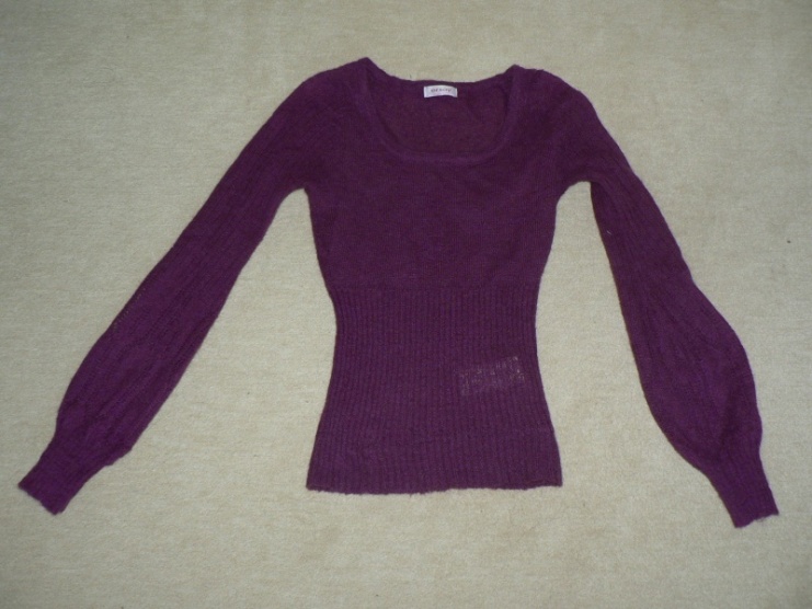 Svetřík je v pasu zúžený, naopak rukávy má od lokte jakoby lehce nafouklé. Lehce průhledný, dá se nosit s tílkem pod, ale i bez.