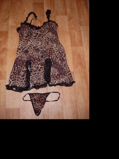 Leopardí košilka lemovaná černou krajkou. K tomu ve stejné barvě tanga.