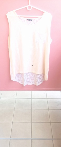 Tenká letní nekrčivá nude tunika, zadní díl je krajkový, rozměry rozměry 45 x 2 cm přes prsa, boky 56 x 2 cm,bez vad top stav, délka 75 cm zadní díl, přední délka 65 cm
